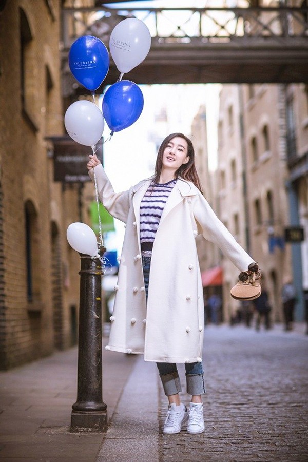 在这组写真中,王丽坤的造型堪称经典简约的范本。她身着一件毛呢质感的白色长外套,内搭清爽的横纹蓝衫,下配深蓝色牛仔裤与白色休闲鞋。这身蓝白搭配的着装风格,不仅衬托出她干净脱俗的气质,更与伦敦街头的建筑色彩形成了和谐共鸣。她秀发披肩,笑容清浅而真挚,无需过多粉饰,那份与生俱来的“素颜美”在镜头下展露无遗,自然优雅的气韵扑面而来。